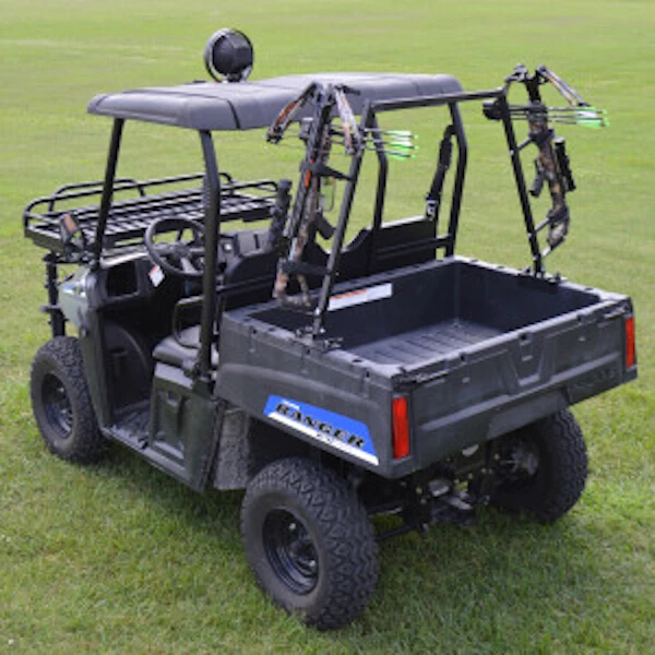 The Double Crossbow Rack is constructed of super-strong aircraft aluminum and includes cushioned, Velcro-secured cradles in which the crossbows are held in place and positioned inward to prevent contact with branches and vines. The unit includes mounting plates and hardware for solid and secure attachment to UTV beds. (For use on Polaris Rangers, mounting plates accommodate use of the bed peg holes, but the Lock and Ride plungers are not included) The Double Crossbow Rack weighs only 8 lbs and ships by UPS. Installs in just minutes on all popular brands and models of UTV’s.