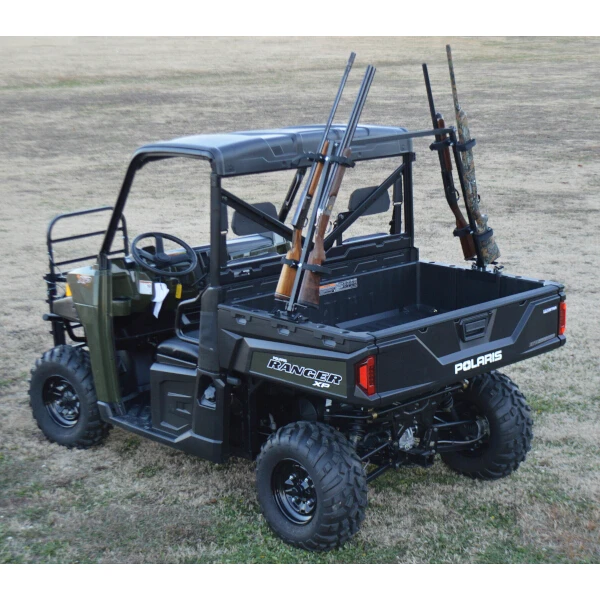 Great Day’s QD804SC UTV Gun Rack is designed to fit all popular utility vehicles that include cargo beds. It attaches securely to the sides of the cargo bed with use of lag screws or bolts positioning gun holders for two firearms on each side. The gun holders are strategically placed at an upward angle to prevent the firearms from being pointed at participants or bystanders. This product is also ideal for outfitters for safely transporting clients and their firearms to hunting areas. The QD804SC is framed in heavy-duty aircraft aluminum and includes cushioned gun clips that can be set at different heights and are moldable to conform to size of the firearms. Fits UTV bed widths of 36”-60”. The Sporting Clays Gun Rack weighs only 8 lbs and ships by UPS. NOTE: NOTE: The Polaris Lock & Ride plugs are NOT included with the QD804SC. Made With Pride in the USA!